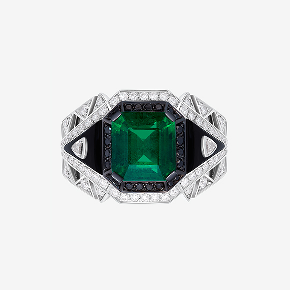 This collection’s powerful geometric lines cleverly trace out layered dragon scales, with tassel embellishments resulting in pieces that are strong yet delightfully delicate. An enchanting emerald sits amongst chic black diamonds, imbuing each stunning piece with mystery and meaning and flirting with both fantasy and reality.